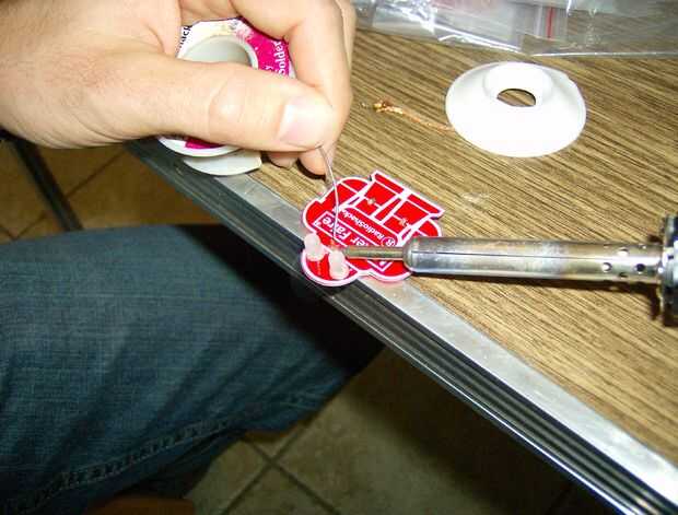 Lo primero que querrá hacer es soldar su insignia o electrónica entre sí. Las divisas que están destinadas a ser clavado en una camisa y vienen con una tachuela de latón que va a soldar pero lo dejamos esa parte.