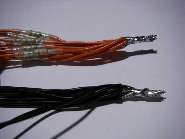 Ya que cada LED del circuito se alimenta de una fuente común, están todos conectados en paralelo. Esto se hace como se muestra por recortar todos los cables a la misma longitud y remover una cantidad generosa de cada cable. Por lo general unos 3/4"(15mm). Entonces son trenzados entre sí y soldados.