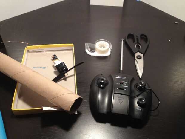 Para esta versión, usted necesitará un - avión rc roto (con el motor y receptor todavía funcional) - cartulina (para la falda) - tijeras - cinta - pequeña caja para montar avión-heli rc mini de trabajo