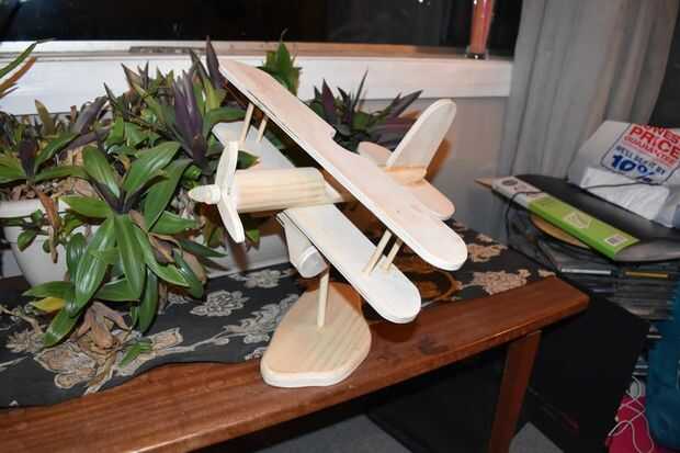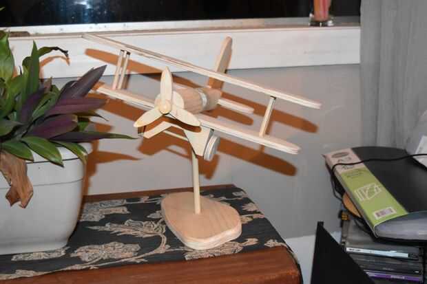 Mi versión es simple que se hace pedazos de chatarra que tengo alrededor de la tienda. Desde capas puntales de madera para las alas y la aleta de la cola, un trozo de carril de mano de pasador para el fuselaje, 10mm y espiga de 4mm para el eje, ala y soporte y unos pedazos de chatarra de pino para el soporte y el tren de aterrizaje.