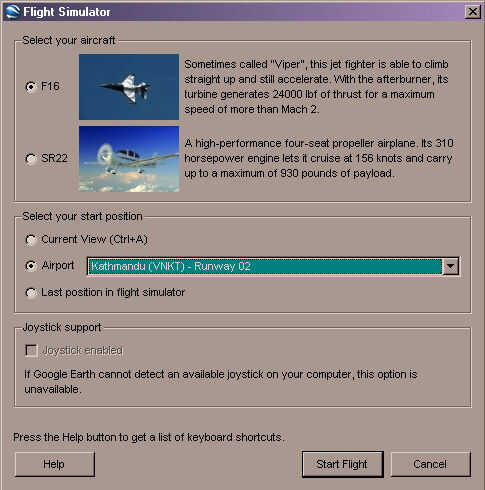 Para llegar al simulador de vuelo, lanzamiento de Google Earth y después de la inicialización, presione < Ctrl-alt-a >. Se abrirá una ventana de opciones, donde usted puede elegir uno de dos aviones y un lugar partido. El movimiento y el gran paisaje realista hace un divertido simulador digno de horas de tiempo desperdiciada.