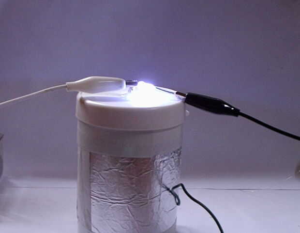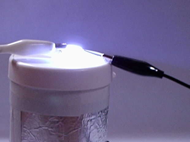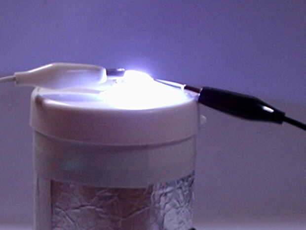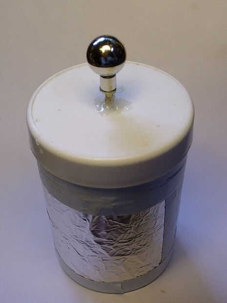 La jarra de leyden de agua es más fácil de hacer que un tarro de Leiden normal porque poniendo la cinta de aluminio perfectamente en el interior del recipiente puede ser muy difícil. Si el trabajo de la cinta de papel está sucio, puede causar un montón de descarga de corona, para drenar su carga muy rápidamente. Así que en lugar de tener un tiempo duro de perfectamente poner cinta de aluminio en el interior del recipiente, simplemente verter agua salada!