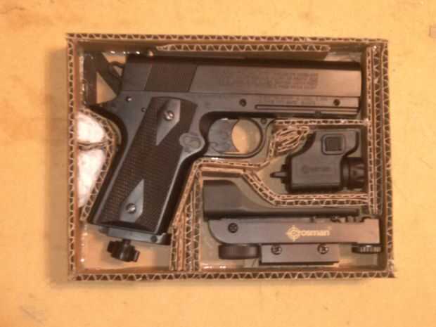 En este caso, la parte posterior de la empuñadura izquierda un espacio abierto bastante amplio. Más bien que intentar completar con cartulina (que fue hecho por la mira láser) un par de piezas de cartón se pusieron a la más amplia zona de la curva para proporcionar fuerza, y el vacío fue llenado con el papel. El papel arrugado y relleno firmemente en cada sección.