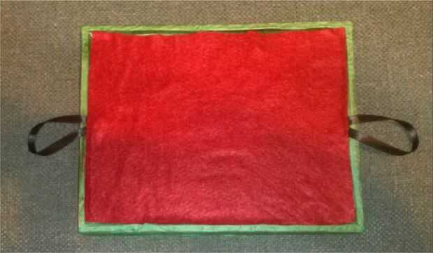 Puesto que los lados son visibles, cubrí la bandeja en una capa de papel de seda verde, usando spray pegamento y alisar las arrugas planas y recorte el exceso. La imagen muestra la parte inferior, que tiene lazos de cinta de pegado en caliente, con el fieltro pegado en luego para cubrir los extremos. La parte superior de la plataforma también está forrada con fieltro.