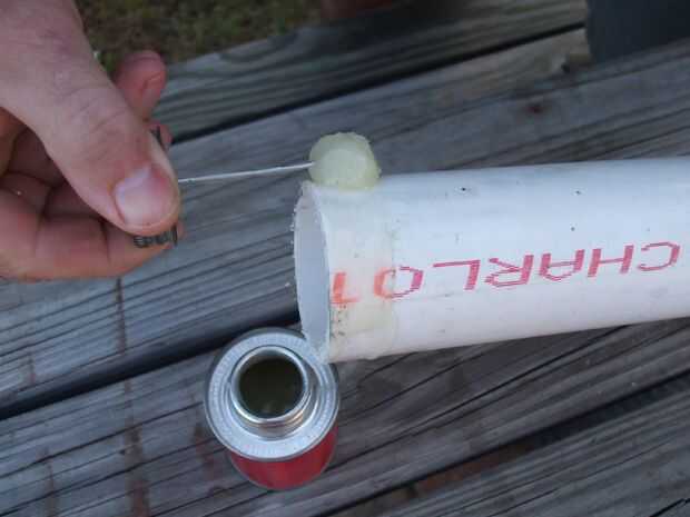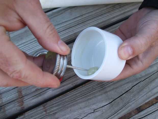 Pegamento ahora en la tapa con el pegamento de pvc, pegue al final que será la parte inferior. El tubo debe tener sólo un gorro pegado en un extremo.