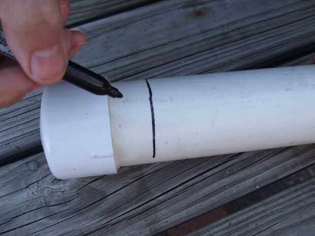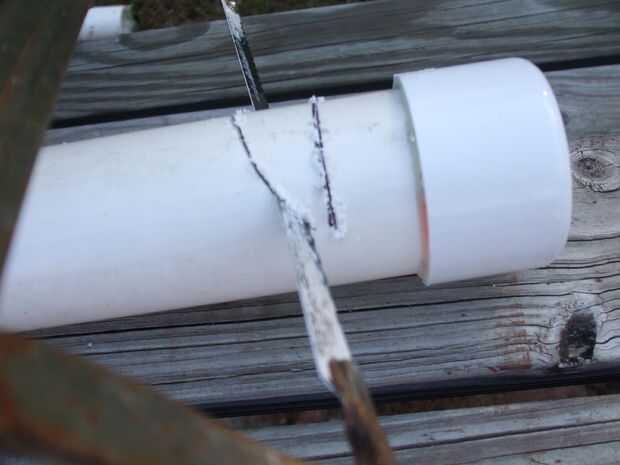 A continuación, cortar diagonalmente de aproximadamente una pulgada sobre el corte original hasta cumplir el primer corte. Ahora debe retirar la pieza de forma de cuña de la pipa. Esto sirve como la apertura a los alimentos a caerse. Esto es difícil de explicar así que miren las fotos si usted está confundido.