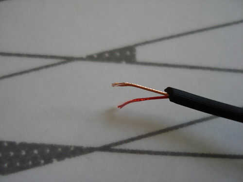A continuación, tira de los cables. Usted puede notar algún material de fibra-como con los conductores de sí mismos. Tira estas cosas hacia fuera con su cuchillo o no ser capaz de obtener una sólida conexión de auriculares al altavoz (gracias a Richard en mi local de Radio Shack en aquél). Como alternativa, puede utilizar un soldador para grabar estas cosas lejos. He encontrado este método mucho más fácil y más eficaz.