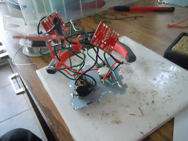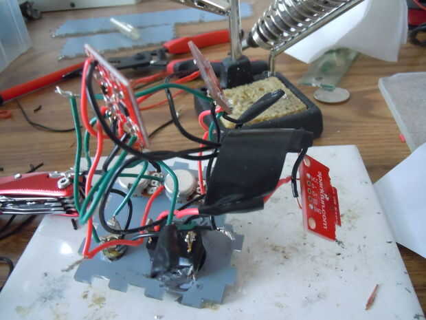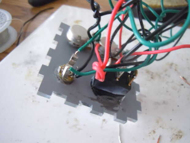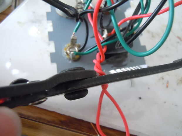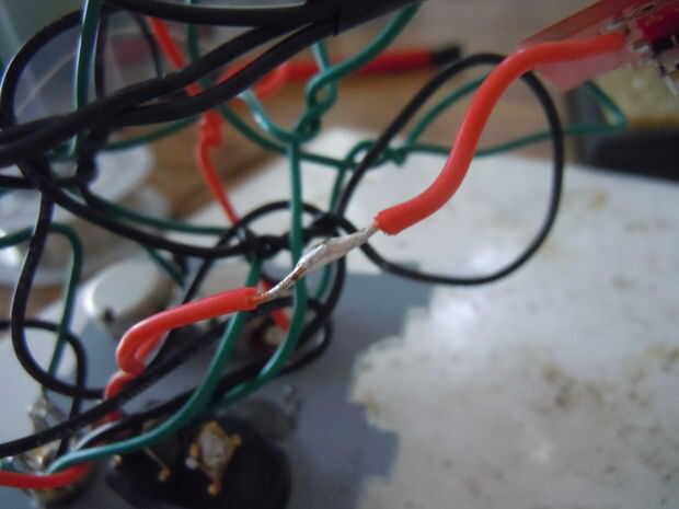 y ahora, porque tengo un montón de cable extra, necesitaba obtener menos para caber dentro de la caja, así que corte el alambre en dos lugares, lo rayas, trenzados entre sí y soldado. Luego lo cubrí con cinta aislante para evitar cortocircuitos. Repita para todos los cables.
