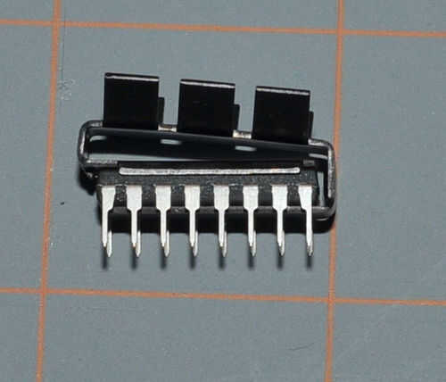 Asegúrese de tener en cuenta dónde está la muesca (el guión) de la IC y deslice los disipadores de calor en ellos. El disipador de calor tiene 2 'flaps', la primera aleta pasa por debajo de la IC y el segundo portaobjetos de aleta sobre el PCB.