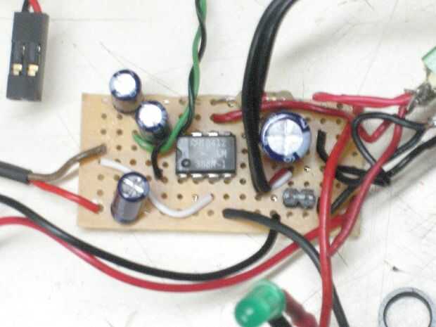 he encontrado que un pequeño trozo de perfboard (alrededor de 1 "x 1¾") proporciona un montón de espacio para construir el circuito y aún así encaja en el recipiente. Como con el diseño de la placa, no hay nada realmente especial o complicada sobre la Asamblea de circuito final. Trate de mantener los condensadores C1, C3 y C4 colocan lo más cerca a U1 como sea posible. La otra cosa que podría cambiar la próxima vez que basarse de estos sería establecer los cuatro condensadores horizontalmente en el perfboard para proporcionar un poco más espacio una vez dentro del contenedor. Minas fueron montados verticalmente y no son muy altas, pero cada poco espacio cuenta. Puede que desee utilizar un zócalo DIP de 8 pines para U1, pero si usted soldar rápidamente con un bajo consumo de hierro debe ser fino. Puede que necesite añadir una pieza o dos de cable de conexión, pero la mayor parte del circuito se puede conectar "punto a punto" con las patas de los componentes. Como con el paso de diseño, ver la orientación de U1 y la polaridad de todos los cuatro condensadores y el LED. Mi altavoz ya tenía un enchufe hembra 2 pines unido a él, por lo que soldado un encabezado de 2 pines 0,1" espaciadas a la Junta para conectar a. Esto ha sido realmente útil con conseguir el altavoz fuera del camino cuando se cambia la batería.