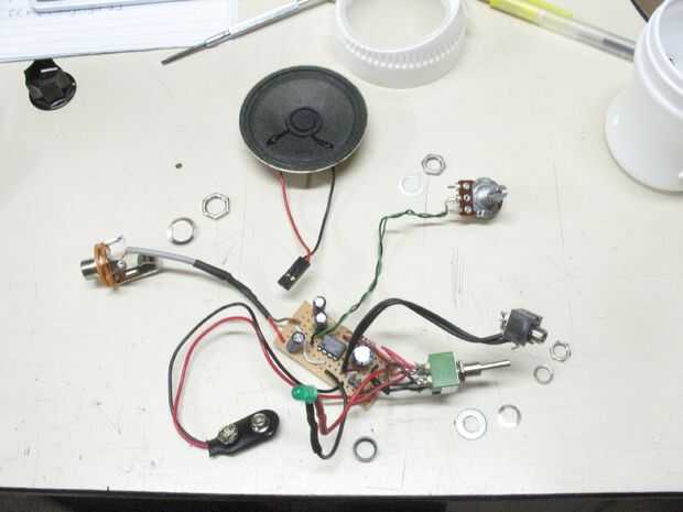 Una vez que el circuito esté completamente ensamblado, enchufar una guitarra y ver cómo el control de ganancia (R2) y control de volumen de la guitarra pueden trabajar juntos para obtener el sonido deseado de los auriculares y el altavoz. Como dije en el paso 3, ir fácil en la ganancia, especialmente la primera vez que conecte sus auriculares - la salida puede ser un poco más potente que usted esperaría. Asegúrese de que el LED se enciende para arriba en ambas posiciones del interruptor, y ya está listo para el paso de montaje final.
