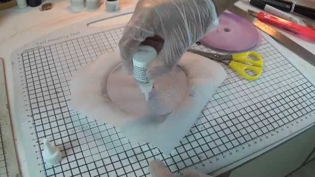 Coloque un disco hacia abajo, aplique una cantidad generosa de pegamento a la superficie y presione el siguiente disco en la parte superior. Utilizar tantos discos como usted necesita para lograr el espesor deseado.