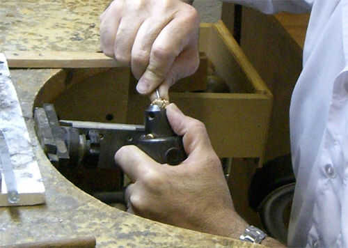 Luego se cortan ranuras en forma de v en los interiores de los dientes, utilizando una fresa, a la altura en que el cinturón de la piedra debe sentarse en el asiento.