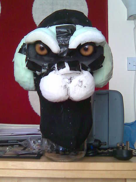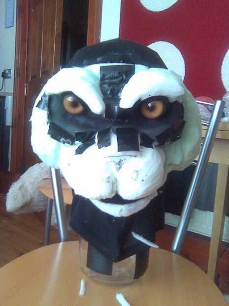 -Instale los ojos pegándolas en la parte inferior de la cresta de la ceja con la pistola encoladora. Aquí la simetría es muy importante, una máscara que escudriña no es una gran idea. Trate de instalarlos por lo que su punto de enfoque es unos pocos pies de frente a cara de máscara.