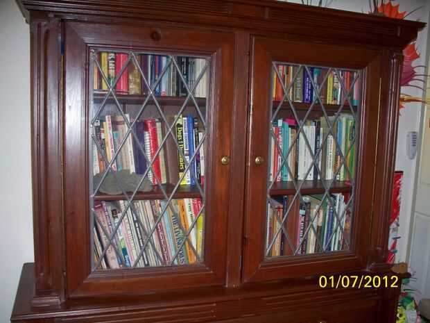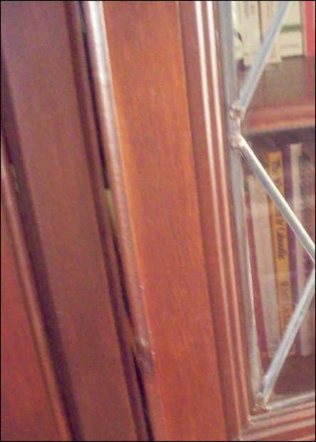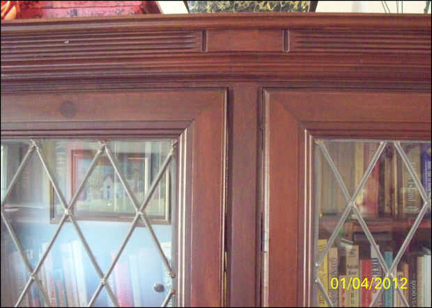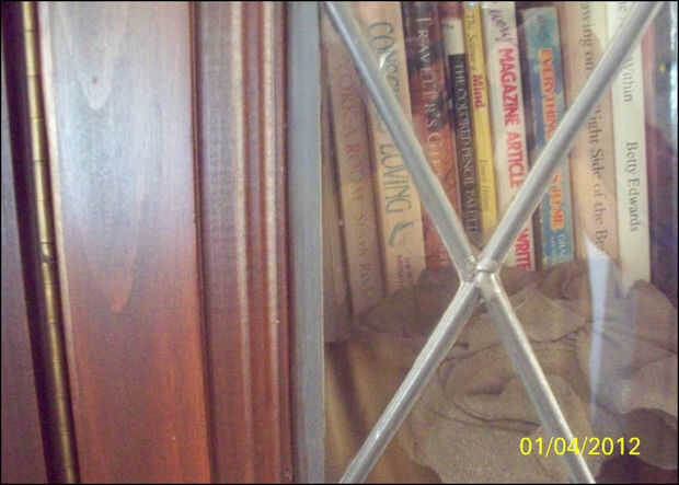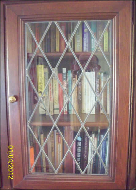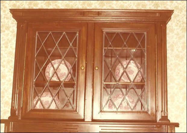 Utilizando técnicas de corte de vidrio en vidrio, hicieron dos paneles para las puertas superiores. Se utiliza el plomo vino, por supuesto y el plomo se suelda, corte de piezas de vidrio e instalada en lugar y luego las puertas fueron tratadas con masilla con la lámpara de color negro que fue cepillado en todas las aberturas alrededor de los pedazos de plomo.