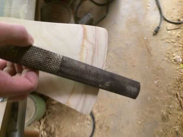El disco fue el primero. Ya que estaba trabajando en esta parte mientras que fuera de casa (foto más adelante para fines ilustrativos) hice esto la manera dura. Empecé con un bloque de lijado y se trasladó a una escofina cuando que iba demasiado despacio. Me pareció útil para sentarse en la hoja de hacha y trabajar con la escofina mientras estaba entre mis piernas. Menos tensión en mis brazos de esa manera pero todavía muy agotador. También fue mucho tiempo y horas.