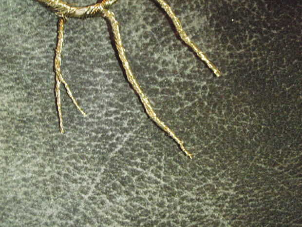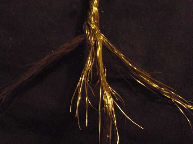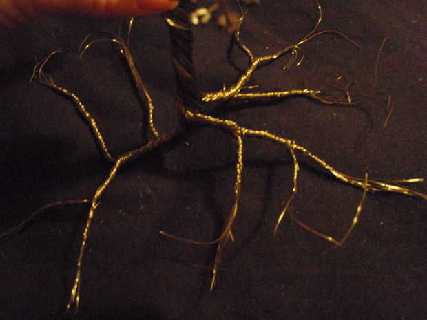 En este punto vamos a torcer como antes, pero en lugar de agregar, te llevará lejos. Comenzar separa los cables en tres grupos y giro ésos, entonces mantenga separación cada uno sucesivamente más pequeños y más pequeños hasta que hay solamente tres o cuatro alambres de izquierda torcida a su longitud deseada. Recorte cualquier alambre sobrante.