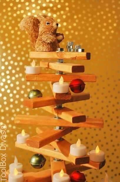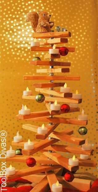 pensar fuera de la caja. Tradicionales árboles de Navidad son hermosos y huelen increíbles. Y sí, opto por un árbol de verdad cada año. Pero este año quería añadir algo un poco diferente a mis decoraciones de Navidad. Yo había estado viendo fotos en línea de estos locos caro "árboles de palo" que manera de a mucho. Quiero decir que me encantó el concepto, a no el precio. Supongo que este año en un poco de un espíritu de Charlie Brown recibí la nueva película de cacahuetes. También quería incorporar algunos metales de la marca del árbol para darle una llamarada industrial. Acorde con mi filosofía de "usar lo que tienes", decidí aceptar el reto de madera de desecho de SawdustGirl, Sandra, en el que utiliza solamente madera para construir un proyecto.