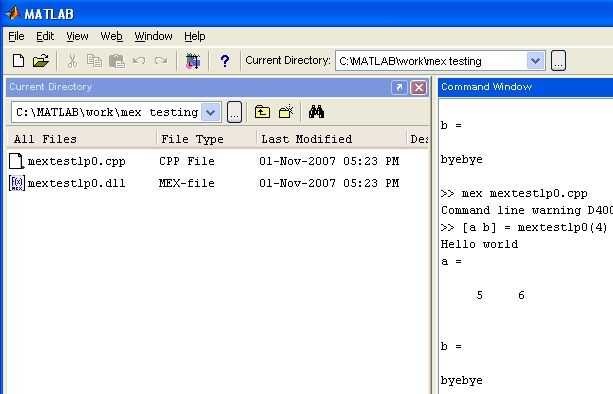 En la siguiente imagen puedes ver el funcionamiento del código. No se preocupe la "ADVERTENCIA de línea de comandos", no parece para nada. Aviso en el lado izquierdo, el directorio actual contiene el archivo .cpp. A la derecha puedes ver me compilar el código y luego la ejecución de matlab.