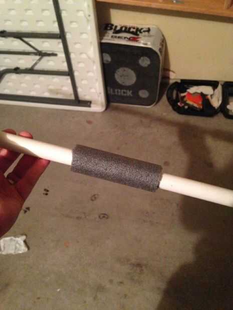 Deslice el aislamiento en el extremo abierto del tubo.  La parte superior del aislamiento debe ser adecuada en el centro de la tubería con el mango de estar completamente en la parte inferior la mitad del arco.  Esto es para que la flecha se dispara desde el centro del arco.