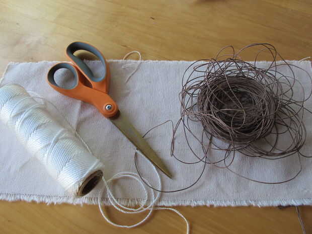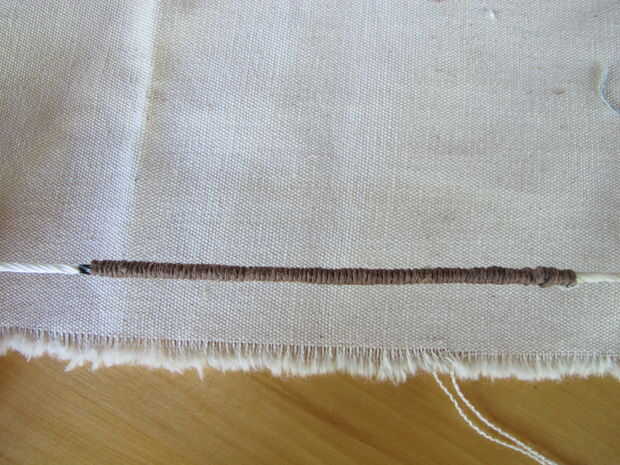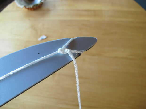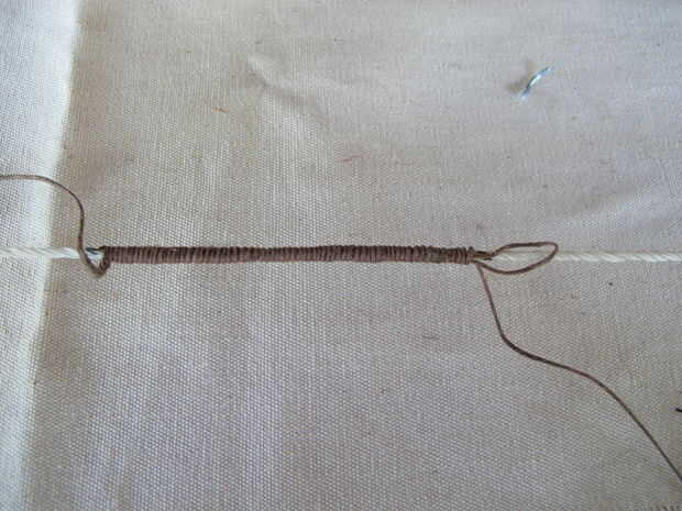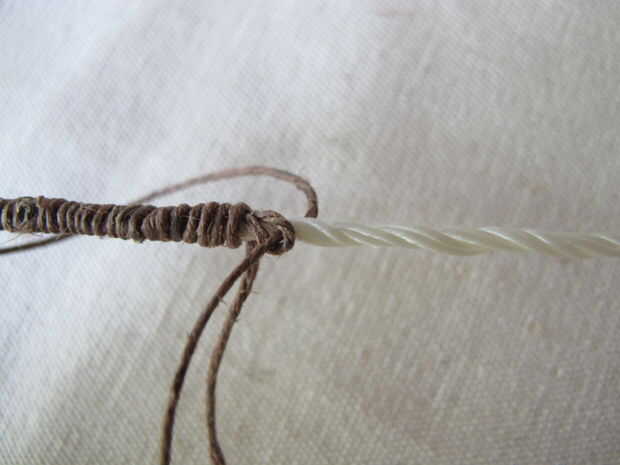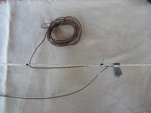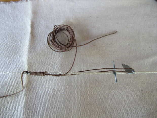Para detener el servicio de venir deshecho y deslizándose hacia arriba y hacia abajo será necesario enhebrar la cuerda de cáñamo a través de la cuerda. Puede insertarse un clavo pequeño en la cuerda retorcida para roscar el cáñamo. La cinta en la foto de arriba sirve para sujetar el cáñamo en posición durante el giro.