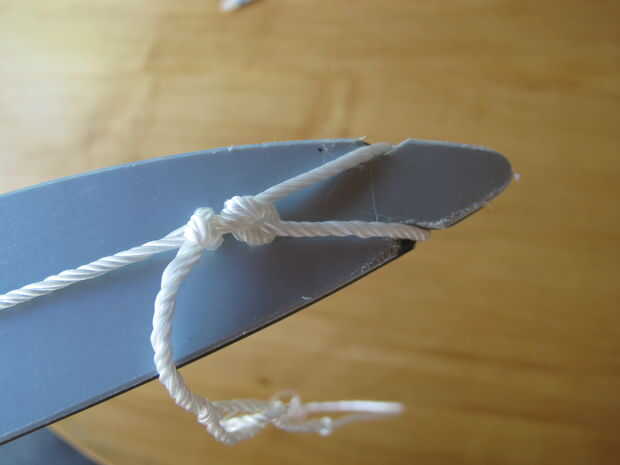 Ahora que tienes un pedazo grande de cuerdas de nylon trenzado, un nudo doble en el extremo de impedir que desenrollar y cortar y fundir el final. Amarrar un as de guía a cada lado de la cuerda en el punto apropiado en la cadena siga cada as de guía con un simple nudo y cortar y fundir los extremos.