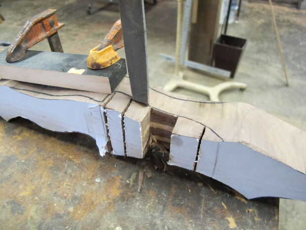 Áspero de la canalización vertical del corte se realiza mejor con una sierra de banda, pero una sierra como la aquí será así. Primero dibuje y corte unos cortes de relieve de los bordes en el papel. Son las líneas negras en la foto de arriba. Los cortes de alivio son pequeños cortes en la madera inútil (la parte de la madera que estamos tratando de quitar) desde el exterior del bloque para el patrón.