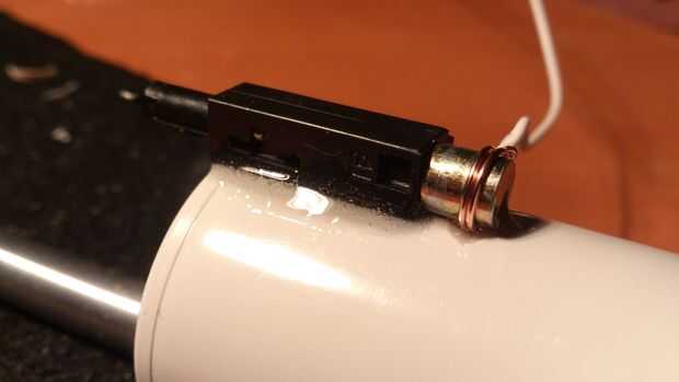 Una vez que el piezo es arena y cableado aplicar el epoxi y dejar seco, asegúrese de que tienes espacio suficiente para presionarlo. Algunos cinta aislante ayuda a sostener el piezoeléctrico en su lugar.