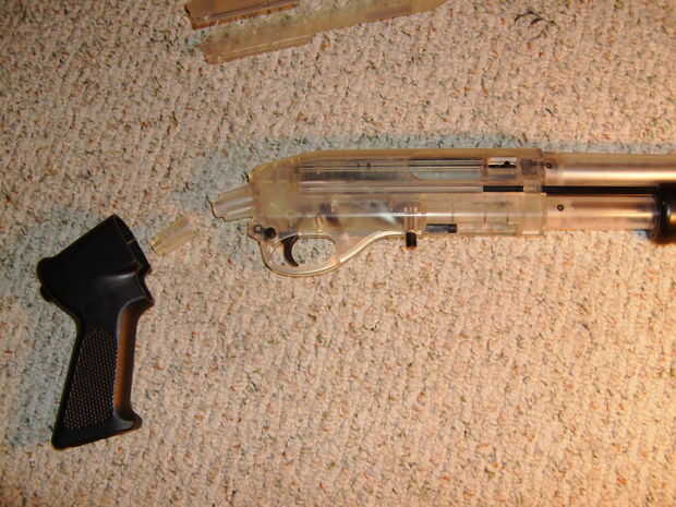 1) Quite los tornillos de cada lado del carril 2) Quite el riel de 3) Quite los dos tornillos a cada lado del cañón 4) Retire el tornillo en el extremo de la empuñadura y tire de ella 5) eliminar el resto de los tornillos en el cuerpo de la pistola