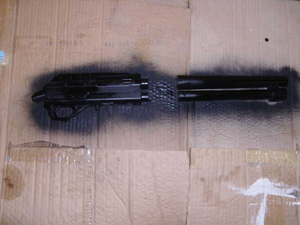 Poner el cuerpo y el barril sobre un trozo de cartón u otra cosa para coger el spray. Ahora para la pintura de pintar una capa delgada buena uniformemente en un lado de la pistola. Después de que se seque voltear una pintura del otro lado.