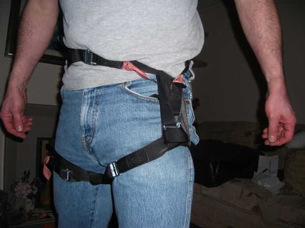 hacer un arnés de emergencia. Nota: no se debe usar con escalada sólo en situaciones de emergenciaPaso 1: Paso 1 Meter un bucle de la correa en su venda de la cinturaPaso 2: Paso 2 Pasar ambos extremos entre las piernasPaso 3: Paso 3 Inserte los extr