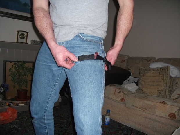hacer un arnés de emergencia. Nota: no se debe usar con escalada sólo en situaciones de emergenciaPaso 1: Paso 1 Meter un bucle de la correa en su venda de la cinturaPaso 2: Paso 2 Pasar ambos extremos entre las piernasPaso 3: Paso 3 Inserte los extr
