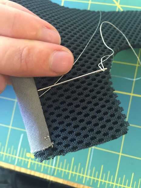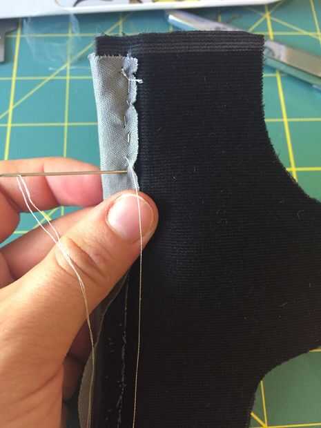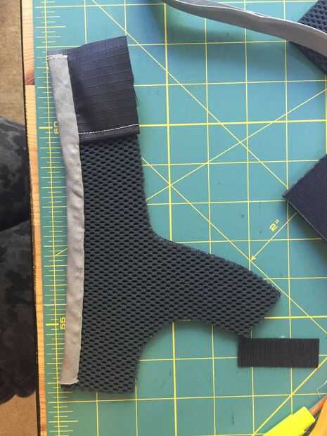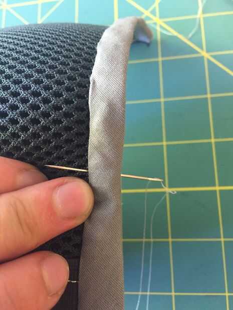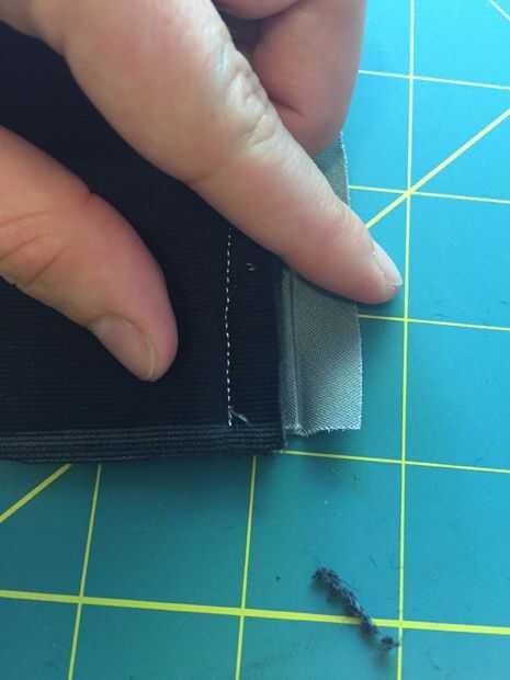 Este paso es difícil, pero quiere voltear la pieza y comenzar a virar hacia abajo de la cinta. El LED debe estar cubierta completamente. Como se puede ver en mis fotos, hice mi camino hacia abajo de la cinta por coser en un ángulo. Usé el ángulo para que mi costura no sería visible desde la parte delantera de la pieza, pero esto era puramente estética. Al final de este paso, debe tener la cinta cosida completamente hacia abajo y los extremos de la misma para ser del mismo tamaño que la pieza del patrón.