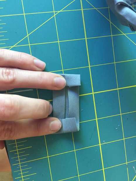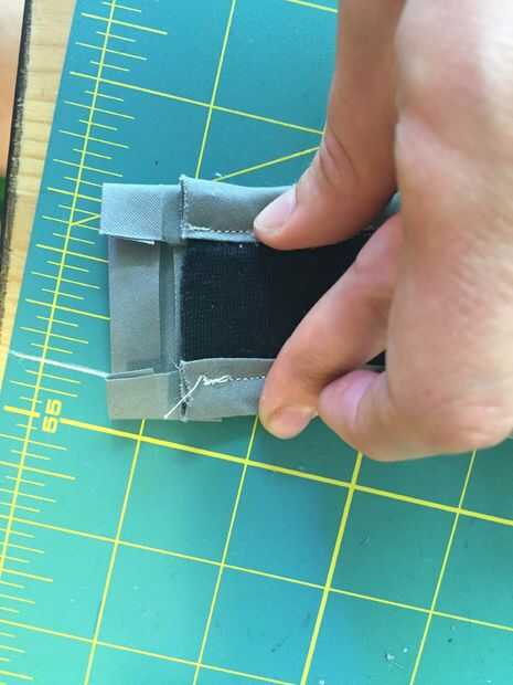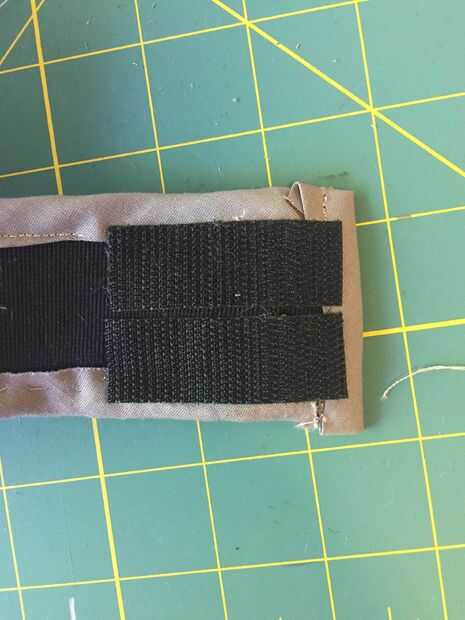 Si usted es capaz de ejecutar curvas cerradas con su enlace, se puede enlazar este borde la misma como los anteriores. Ya que no tengo esa habilidad, corte un pequeño trozo de tela había doblado en los bordes (imagen 1) y había atado al extremo abierto de la bolsa. Luego até dos piezas de velcro adhesiva respaldada.
