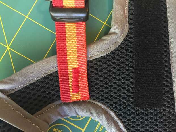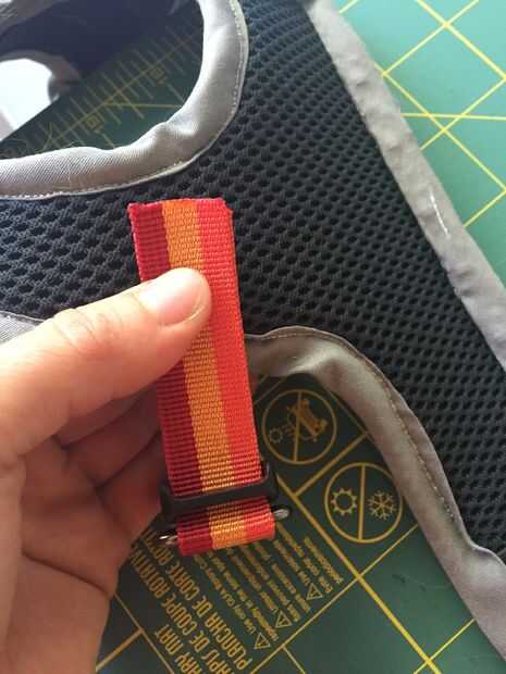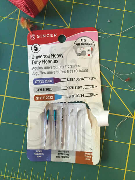 Para este paso, usted necesita cambiar a agujas de trabajo pesado (imagen 1) quedo 4" pieza de las correas y el anillo de hilo a D a través de él. Doble en el centro y luego sujete las hebillas (imagen 2). En este punto, deberías probar el chaleco en su gato para determinar dónde colocar las hebillas. Las hebillas deben ser 1-2 pulgadas por encima de las tiras de velcro, donde serían los omóplatos (pero los gatos no tienen un hueso del cuello) Colocar la cinta donde guste y luego lo vira hacia abajo usando la puntada de zig zag en la máquina.