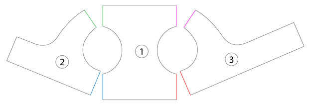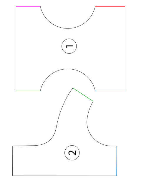 Las piezas del patrón con cinta adhesiva a lo largo de los bordes cortos y rectos. Coincidir con las líneas de color como se muestra en el diagrama en imagen 5.