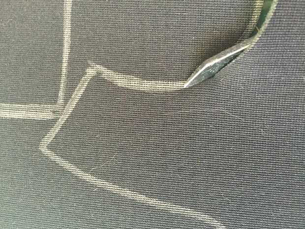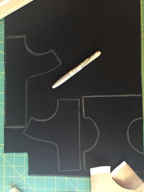 Coloque la tela sobre la mesa. Coloque sus piezas en la parte superior de una manera que utiliza la menor cantidad de tela y trazar con tinta visible. Usé la plata sharpie aquí en tela negra. IMPORTANTE: Asegúrese de que todas las piezas del patrón son cara arriba.