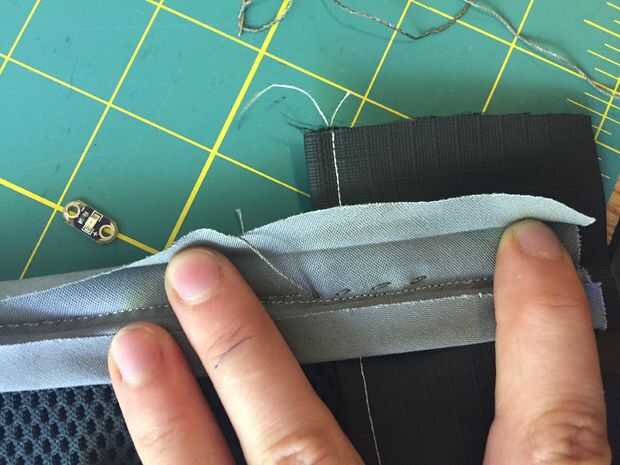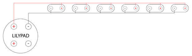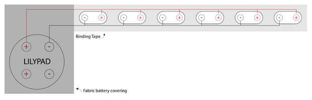 Estudiar el diagrama del circuito en la imagen 2 para visualizar donde van los componentes. La imagen 3 muestra a la tela piezas junto con el circuito. Como se puede ver, el Lilypad es cosido por debajo de la cubierta de tela que tengas ya creadas, y el resto del circuito se cose a la cinta que, a fijarse en el paso anterior.
