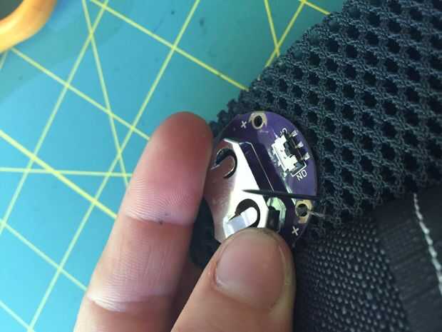 Coser el Lilypad en lugar pasando varias veces el hilo por el agujero positivo en el tablero. Cosa las puntadas de apretado, estrechas para asegurar una conexión sólida. Luego coser el hilo de la batería y en el enlace para llegar al lugar donde pones tu primer LED.