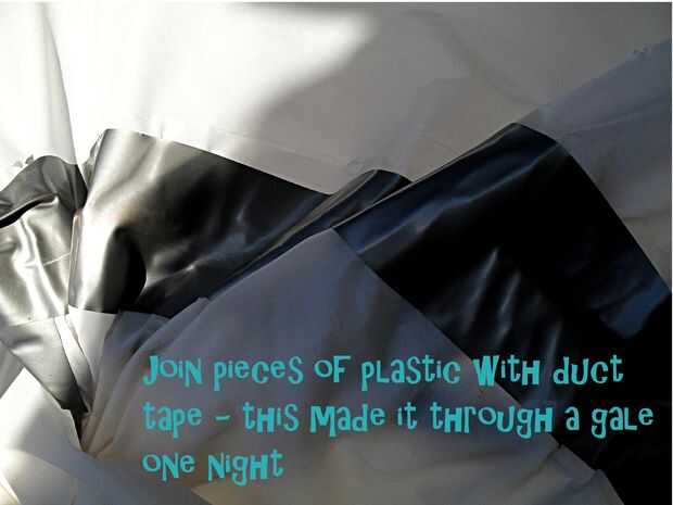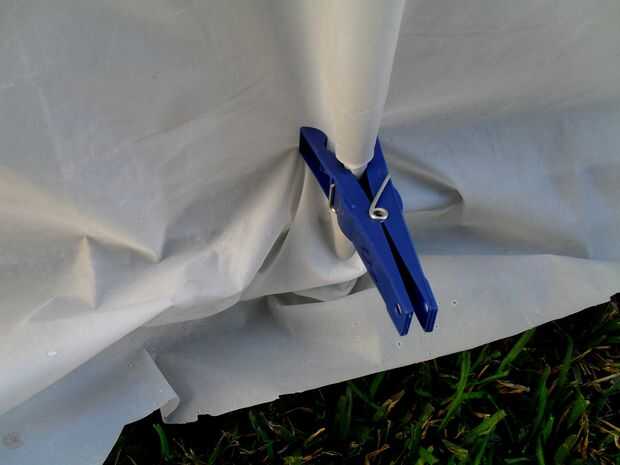 Plástico de Peg alrededor de las estacas firmemente. Es probable que sople ahora.