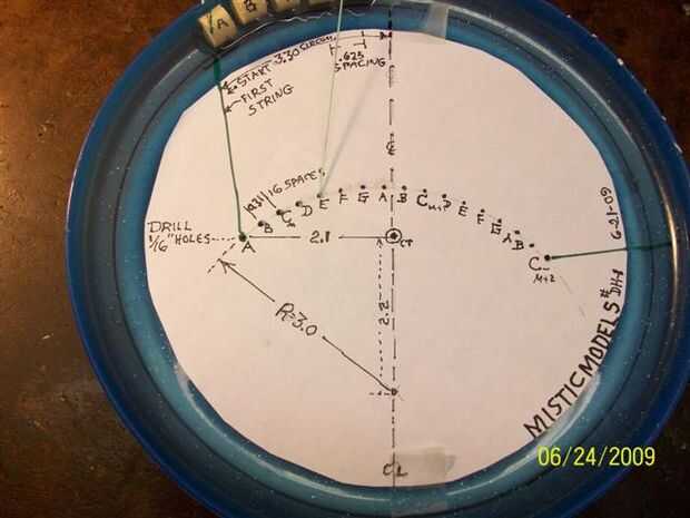 Finalmente en los puntos de arco perforar 17 usando la broca de 1/16 pulg. Estos son los agujeros de anclaje. Ellos se espacian.30 pulgadas aparte. cinta en un disco de papel en el interior del disco a utilizar para la marca.