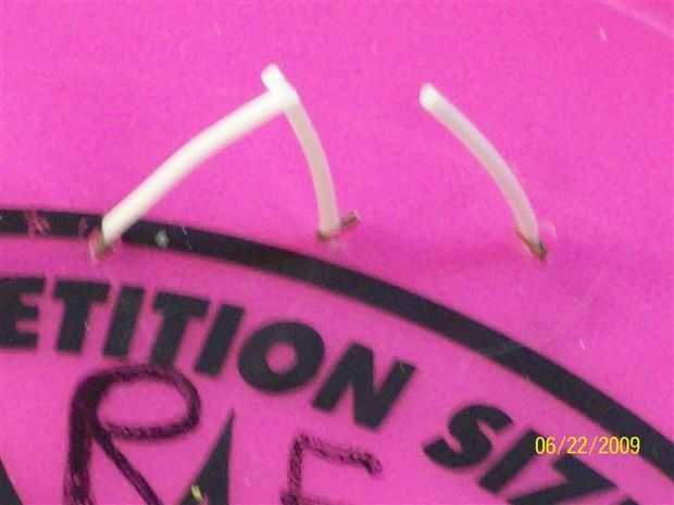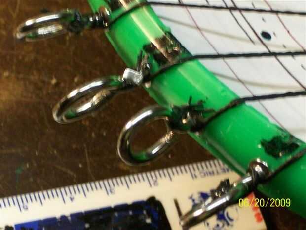 2-tendido-corte cada cadena como necesita aproximadamente 2 pulgadas más de largo que se muestra en el diagrama. Hacer una presión en un extremo usando un tubo de presión y alicates. Entonces haga un nudo simple y tire firmemente. luego girar la cadena en sentido contrario dos veces en la parte superior del cuello y tire la cadena hacia abajo en los agujeros de anclaje. Agarrar con una pinza hemostática en la parte inferior. Tire la cadena y para arrancar dentro de una nota inferior a la nota deseada. La longitud de la cerradura en la parte inferior con el hemo. Luego coloque una encrespadura u junto a la hemo bloqueado. Luego retire la hemo. Finalmente volver a sintonizar girando en sentido horario el tornillo del sintonizador. Esto se repite a continuación para las restantes cuerdas de la nota. Corte el sobrante.