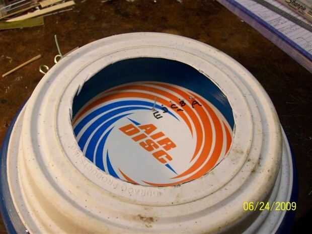 1-resonador-utilizada para crear volumen. Cualquier plato puede ser utilizado pero debe cortarse en el pliegue inferior. Aquí se utilizó una bandeja sólida. Añade rigidez al disco también cuando pegado.