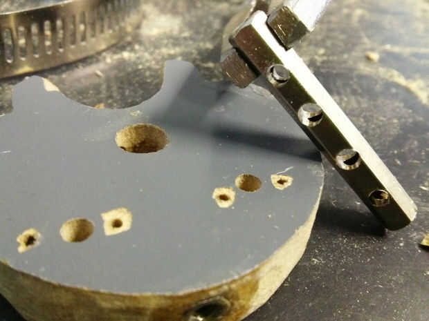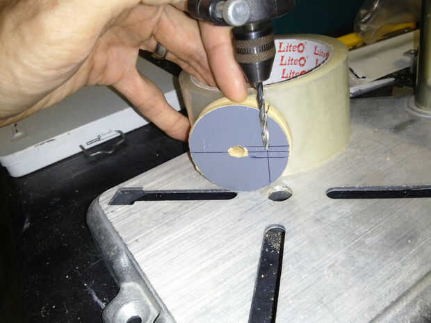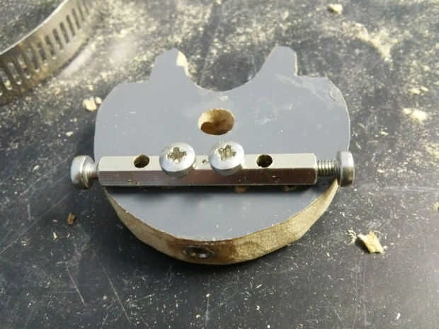 Luego perforaron tres agujeros en los bordes del disco, con brocas sucesivamente más grandes para evitar que se resquebraje e inserta algunos separadores de circuito hexagonal M3 roscado y había pegado en lugar. Taladré orificios alineados en el cuello de la muñeca por lo que ahora pude conectar fácilmente la cabeza a la junta con los tornillos de máquina cortos.