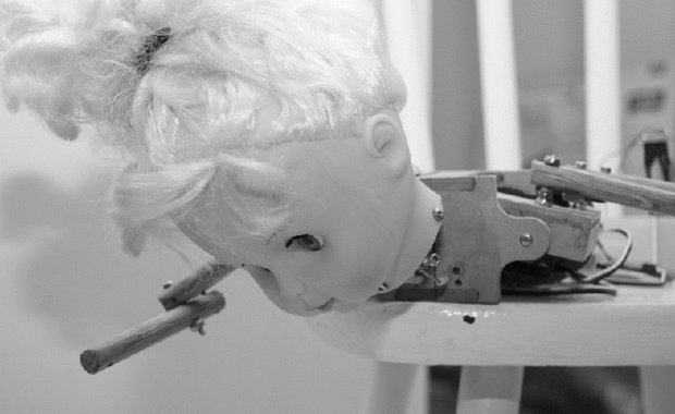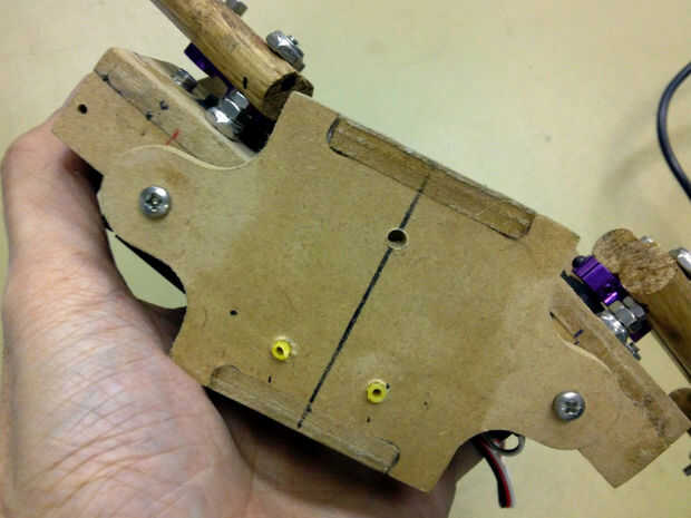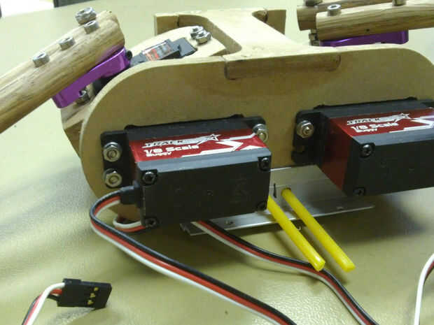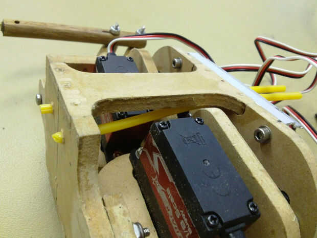 Para hacer el movimiento de cabeza que decidí ir con los servos montados en la parte trasera del robot, con su fuerza aplicada a la cabeza por varillas de empuje, similares a cómo las RC aviones de controlan de sus aletas.