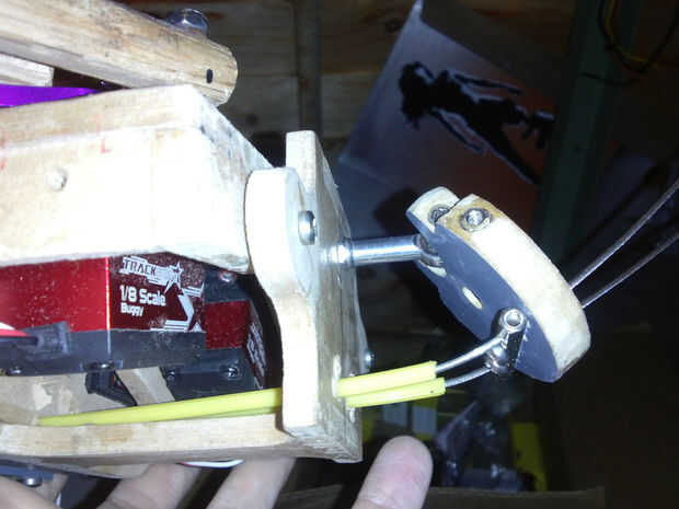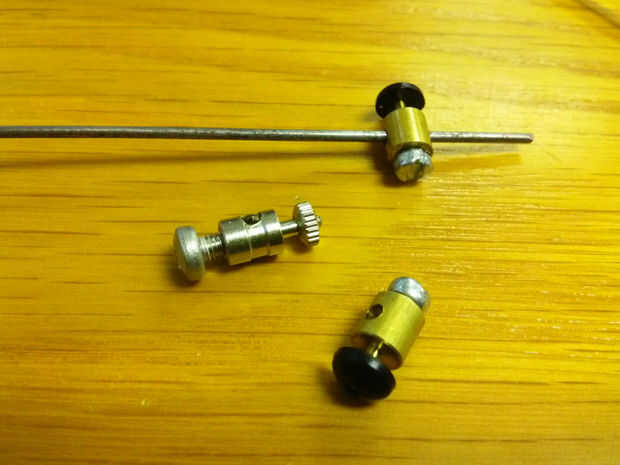 Mi primer intento fue utilizar varillas de empuje de alambre rígido de un viejo avión RC que encontré en la chatarra, pero eran demasiado rígidas para pasar por las curvas en los tubos sin encontrar gran fricción. Después descubrí algunos cable trenzado flexible de frenos de bicicleta/engranajes que funcionaba mucho mejor. Tiene un perfecto compromiso entre rigidez (necesario para evitar demasiada flexión donde el cable está fuera del tubo) y flexibilidad (para pasar por curvas en el tubo) para esta aplicación.