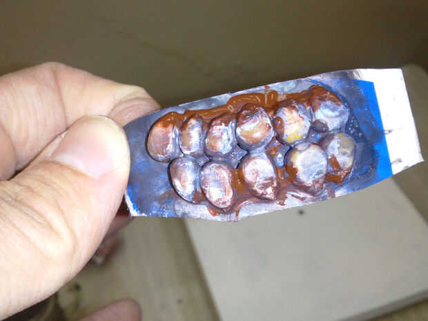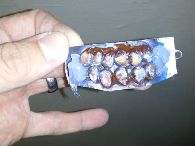 La pintura fue hecha en varias capas, a partir de coladas de luz, seguidos por los negros y marrones. Limpiar la mayor parte de la pintura con un trapo en cada paso, dejando áreas más oscuras en los huecos entre los dientes. Por último pongo algunos rojizo grueso marrón en las encías.
