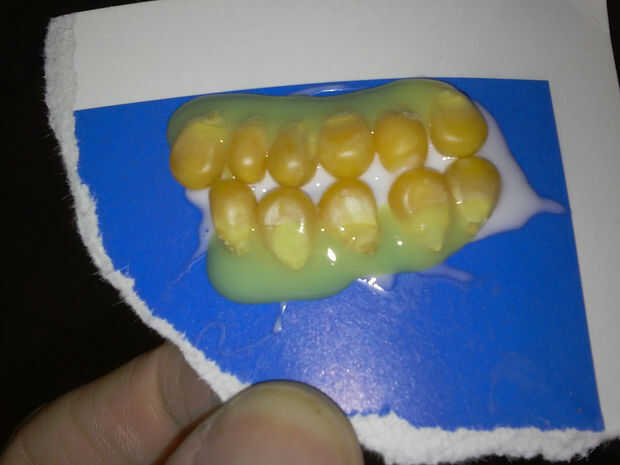 Luego tengo algunos granos de maíz un pegamento de madera usado para pegarlas en un trozo de cartón fino (recomiendo tarjeta negra, no azul como yo). También construido las "gomas" con algun contacto pegamento adhesivo (pegamento de madera era demasiado líquido para hacerlo).