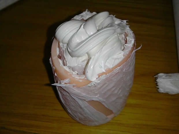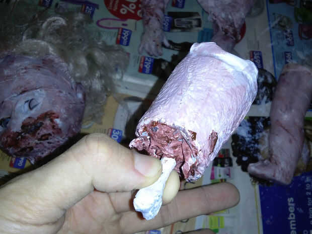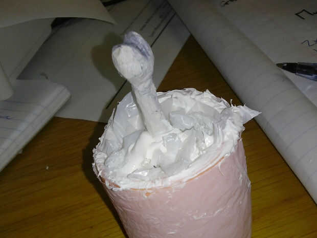 Uso una para pintar masilla para llenar para arriba el extremo de la pierna. Pegué unos pedacitos de rasgado-para arriba de la bolsa de plástico en allí para hacer extra carnoso.
