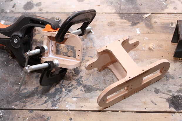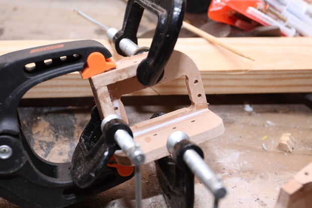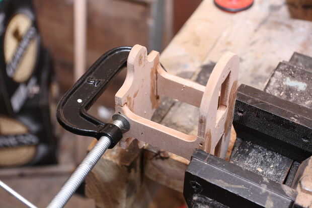 Continuación hasta es sujetar las piezas juntos. Desde que tuve mis piezas cortadas de MDF de 6 m m usé PVA (cola fría Alcolin en particular), si se cortan las piezas de acrílico u otros materiales que usted necesitará elegir un pegamento adecuado. Esto es donde viene bien tener un montón de pinzas. Como se puede ver en mis fotos, no tengo suficientes abrazaderas, usé mi tornillo de Banco también.